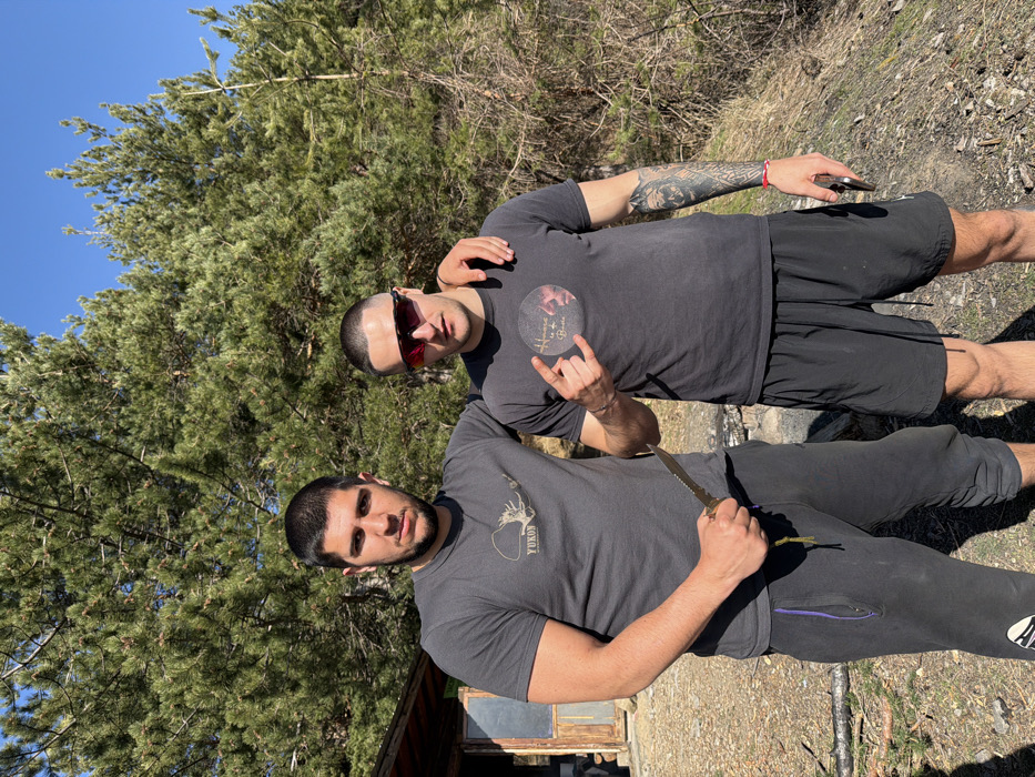 Two adult males are depicted standing outdoors in a forested area of Kladnitsa, Bulgaria, under a clear blue sky. The male on the left, with short dark hair and a muscular build, wears a dark grey t-shirt with a "YUKON" graphic and dark grey athletic pants. He holds a tan-handled, serrated blade knife in his right hand, oriented downwards. His left arm is placed on the shoulder of the male on the right. The male on the right, also with short dark hair and a muscular build, wears dark sunglasses, a dark grey t-shirt with a circular chest graphic, and black athletic shorts. His left arm displays a full sleeve tattoo. He makes a "rock on" hand gesture with his right hand and holds a dark-colored smartphone in his left hand. A rustic wooden structure with a window is partially visible on the far left. The background is composed of dense pine trees and dry brush. The ground surface consists of dirt and sparse vegetation.