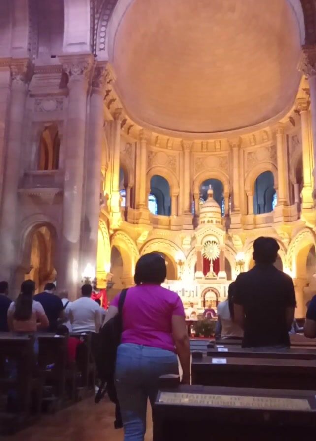 interior of a church filled with people. The camera is positioned from the back of the room, and the scene is viewed through the rows of pews. Many people are seated, facing towards the front. A woman wearing a pink shirt and jeans walks in front of the camera. She is holding a black bag. The front of the church is visible, with a priest standing at the altar and several other people gathered near him. The architecture is elaborate, with grand columns and arches, and a large dome ceiling. The church is lit with warm, yellowish lighting.