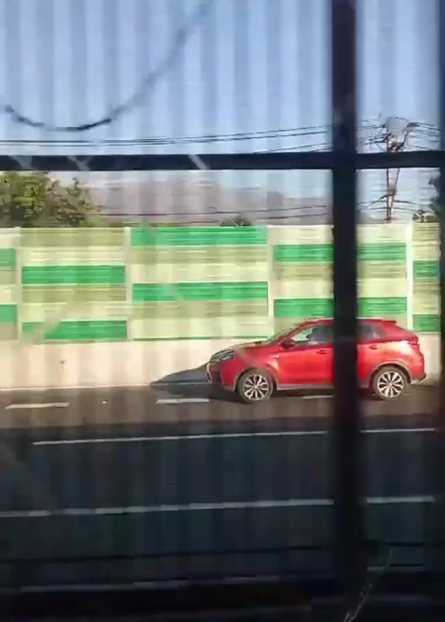 red car on a highway as seen through a window. The camera is likely inside a moving vehicle, possibly a train, as indicated by the window frame. The red car is moving in the same direction as the camera. The highway is lined with green and white noise barriers. Beyond the highway, there are trees and residential buildings. The sky is bright and clear.