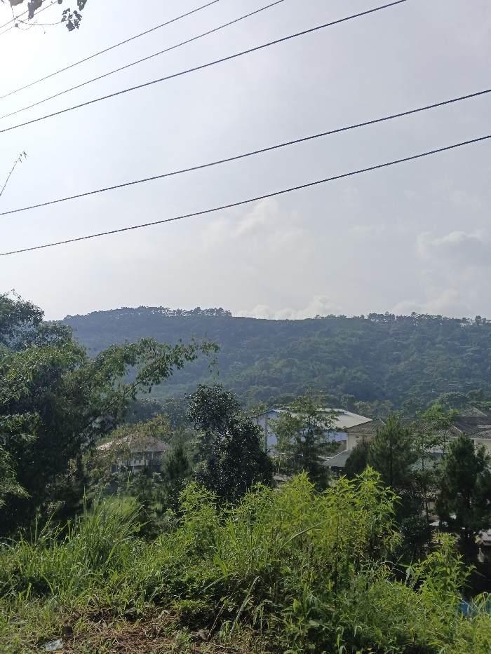 A hazy day over a hilly landscape with lush green trees. A structure peeks through the foliage. Overgrown grasses fill the foreground. Above, electrical wires stretch across the sky. A mountainous horizon with a dense tree line fades into the distance. The overall scene exudes a serene, natural ambiance.