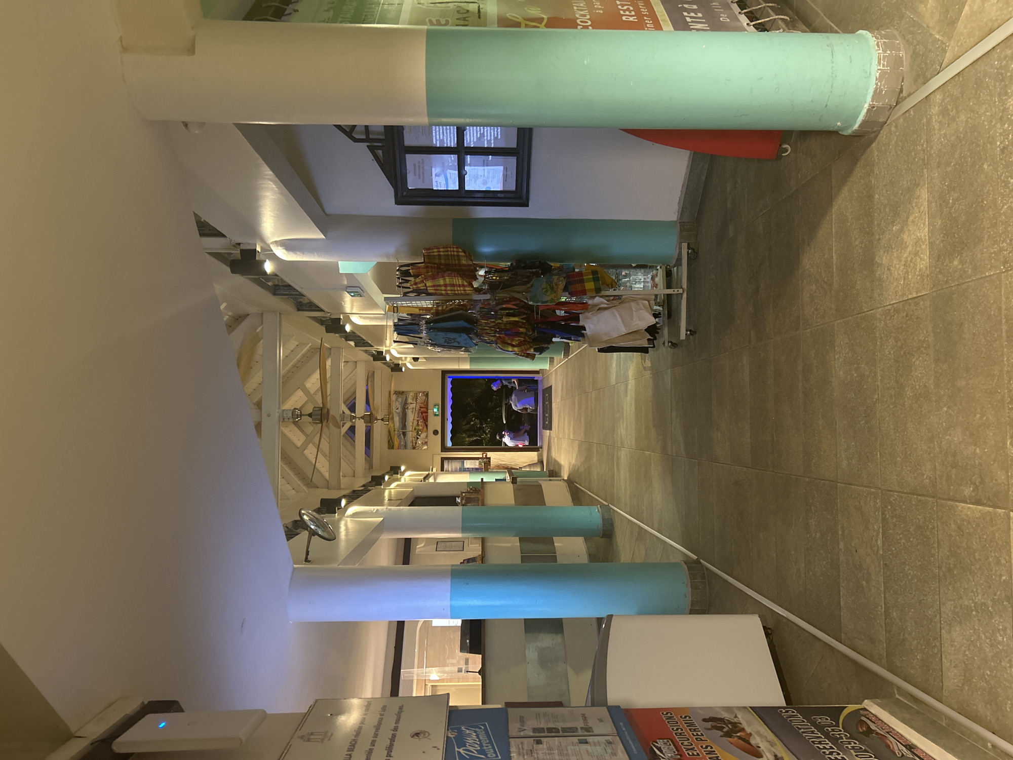The image depicts an indoor corridor in Le Gosier, France. The corridor is lined with white and blue-painted cylindrical pillars that support the ceiling. A clothing rack with bags is positioned in the middle of the corridor. In the background, there is a partially visible entrance to an area with people. Display stands with advertisements are visible in the foreground. The floor is tiled.