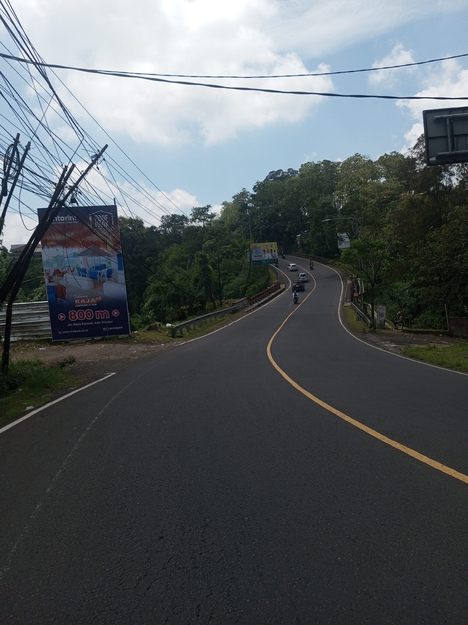 road curving uphill through a green, forested area. A yellow line marks the center of the road. Several vehicles, including cars and motorbikes, are visible further up the road. A large advertisement billboard stands alongside the road, displaying the words "Roof Park" and "Istana Raja FO" with the distance of "800 m". Power lines and utility poles are visible near the billboard. The location of the scene is not in Phonethan, Laos. The billboard indicates the location is Jin. Raya Puncak, Kab. Cianjur in Indonesia.
