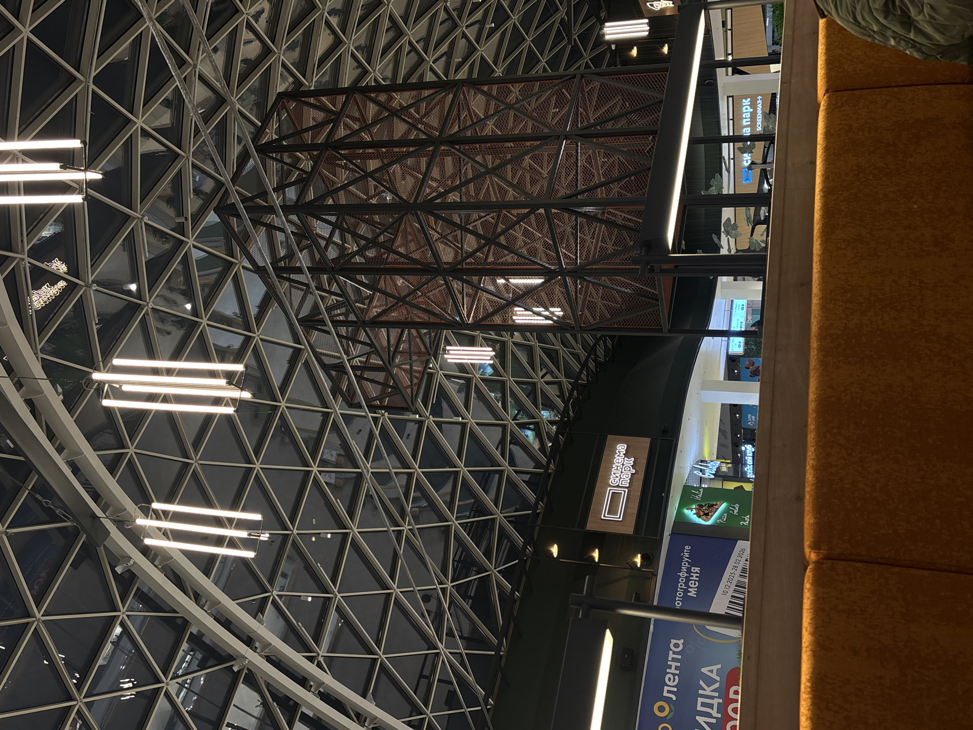 ceiling of a shopping mall in Perm, Russia. The ceiling is a dome with a network of triangular glass panels supported by a white metal frame. Several long, horizontal, fluorescent light fixtures are suspended from the ceiling. A large, rectangular, dark brown metal structure with a lattice design hangs from the ceiling. A beige-colored upholstered bench is visible on the right side of the image. Shop signs are visible to the right of the metal structure, with the name "Синема Парк" (Cinema Park) written on one of them. Also visible is a food stall sign that says "Pizza Golato Pasta Italia". Other posters are partially visible, advertising "Лента" (Lenta), and "отографируйте меня" (Photograph me).
