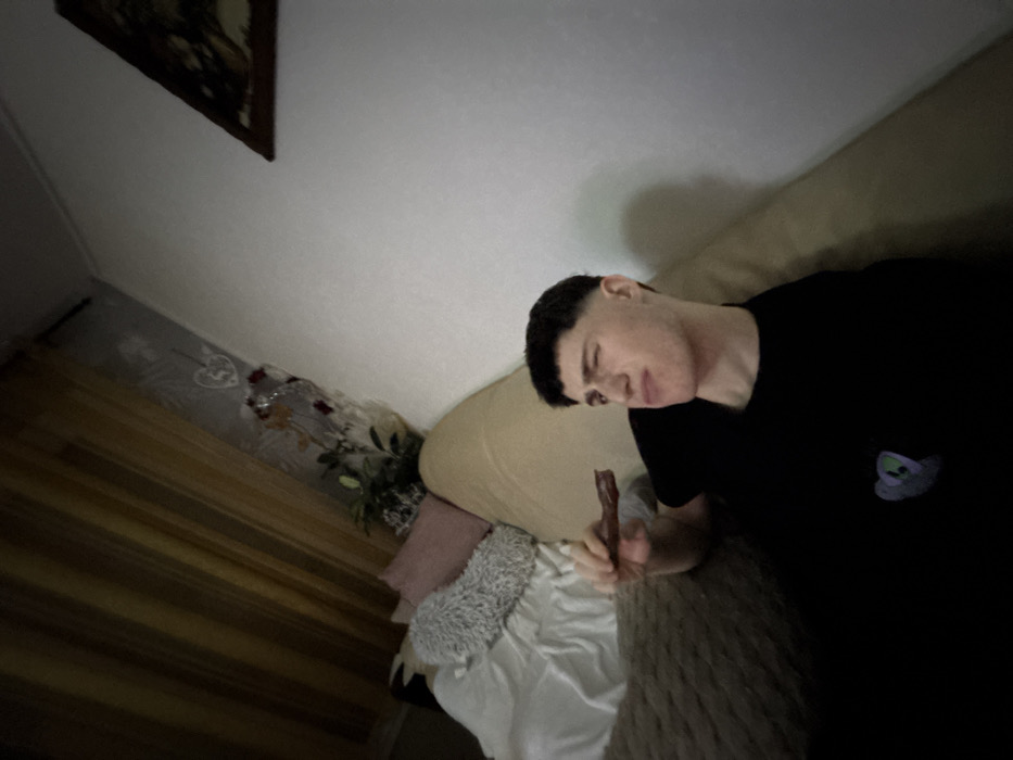 A young man with short, dark hair lies on a bed or couch, holding what appears to be a cigar or similar object. He's wearing a dark t-shirt with a small, colorful design. The room is dimly lit. The background includes a light-colored pillow, a decorative pillow with a furry texture, and what looks like a bouquet of flowers. A framed picture hangs on the wall in the background. The overall composition is slightly tilted.