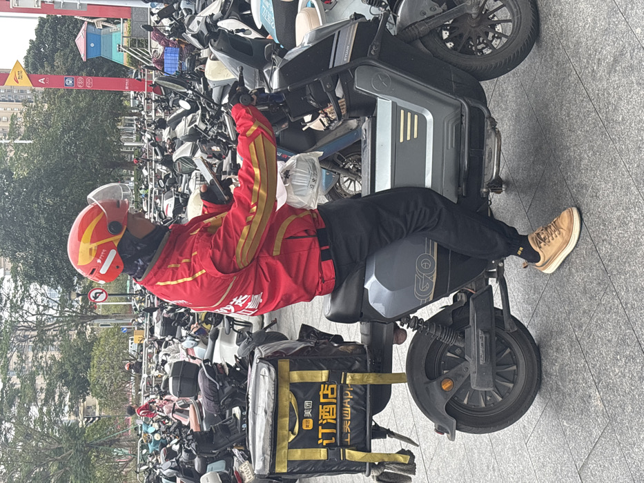 A delivery driver wearing a red and gold jacket and helmet sits on a parked electric scooter amidst rows of other scooters. He is wearing black pants and tan shoes. The scooter has a large delivery bag attached to the back, adorned with Chinese characters. The scooter is parked on a patterned tile surface. In the background, buildings and trees are visible.