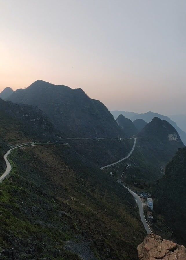 The video displays a panoramic view of a mountainous landscape, likely at dawn or dusk given the soft, diffused light. A winding road snakes through the valleys and along the mountainsides. The slopes are covered in vegetation, appearing green and rocky. The sky is a pale, even color. The camera is positioned at a high vantage point, potentially from a rocky outcrop in the foreground. There is no visible human activity.