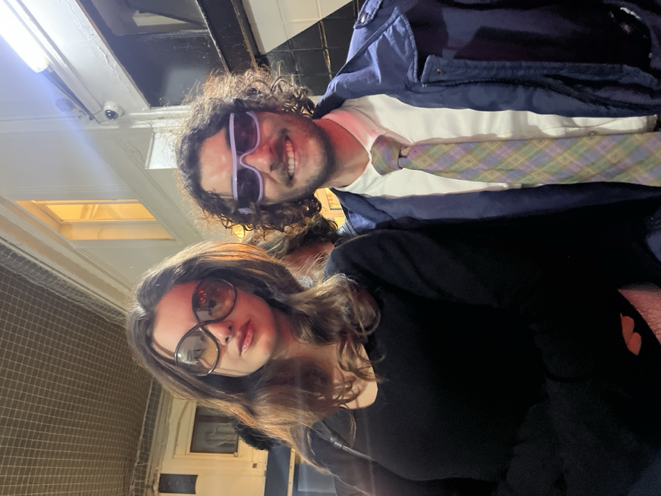 Two young adults, one female and one male, are depicted posing for a photograph in an outdoor urban setting in Paris, France. The background features a typical Parisian building facade with white paint, architectural moldings, and an illuminated window to the left. Overhead, a white grid-like netting is visible. A white security camera is mounted high on the wall to the right. The female, positioned on the left, has long brown hair and wears oversized dark-framed sunglasses, a black long-sleeved top, and what appears to be a dark shoulder bag strap. Her lips are visible with red or pink lipstick, and her expression is neutral. Her left arm is crossed. The male, on the right, has dark curly hair, a mustache, and a beard. He wears light purple rectangular sunglasses, a white collared shirt, a plaid patterned tie in shades of green, purple, and cream, and a dark blue jacket worn open. He is smiling directly at the camera. The scene is lit by artificial light sources.