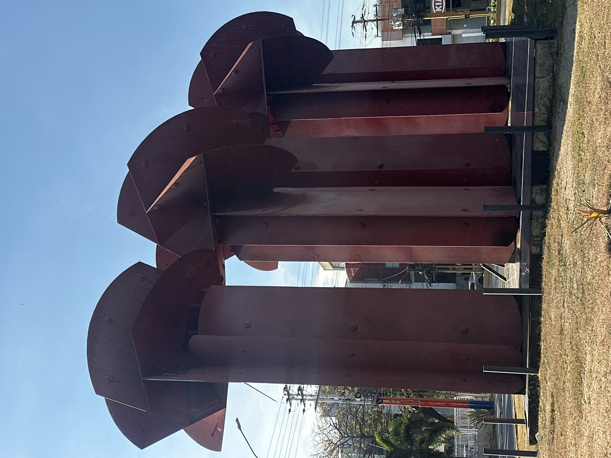 A monumental, weathered reddish-brown metal sculpture stands centrally in a grassy traffic island or median strip under a clear blue sky in Valencia, Venezuela, specifically at the intersection of Avenida Cedeño and Avenida Bolívar. The sculpture, known as "La Llama Eterna" (The Eternal Flame), consists of multiple tall, rectangular vertical panels secured with visible bolts, topped by layered semi-circular or quarter-circular metal plates, also bolted, resembling a stylized fan or bloom. The metal shows signs of rust and patination. The structure is supported by a dark, slightly raised concrete base, around which short, dark grey metal bollards are positioned. The immediate foreground displays dry, yellowish-brown grass with sparse vegetation. The background to the left features utility poles with numerous overhead power lines, a street lamp, partially defoliated trees, and multi-story urban buildings. To the right, commercial buildings line a street, with a "KIA" automotive dealership sign clearly visible on one facade. Vehicles are present on the surrounding roadways, indicating an active urban setting. The scene is brightly illuminated by direct sunlight.
