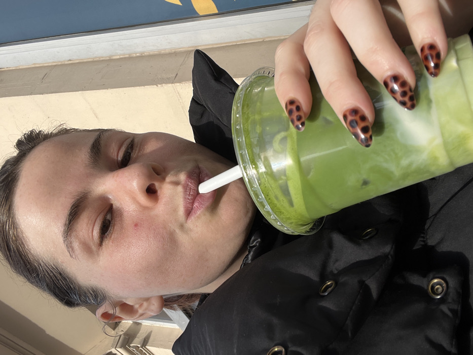 A close-up, high-angle outdoor shot captures a female individual consuming a beverage in Roubaix, France. The subject, appearing to be an adult female, has light brown hair pulled back, exposing her forehead and ears. A small reddish blemish is visible on her left cheek. She wears a black puffer jacket featuring brass-colored snap buttons. Her right hand, prominently displayed, has almond-shaped fingernails painted with a dark brown leopard print pattern. This hand holds a clear plastic cup containing a layered green beverage, consistent with a matcha latte, showing a distinct separation between a lighter, milky bottom layer and a darker green top layer. A white plastic straw is inserted into the drink, with the subject's lips puckered around its end, indicating active consumption. The background, out of focus, reveals a sunlit urban environment, including a light-colored building with a curved architectural detail on the left and a dark blue surface with a yellow/orange element on the right, possibly part of a storefront or sign. Bright sunlight illuminates the scene from the right, casting subtle shadows on the subject's left side.