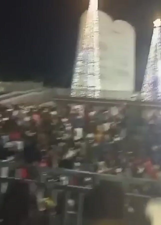 nighttime scene of a large crowd gathered in front of a brightly lit stage. The crowd is dense, and several people are standing behind a metal railing. The stage appears to be elevated, and there are two large, illuminated Christmas trees behind it, flanking a tall monument with inscriptions. Strong lights shine from the stage, creating a bright glare. The atmosphere seems festive, suggesting an event or celebration is taking place. A watermark indicating "TECNO CAMON" is visible in the lower left corner of the screen. The camera is held by someone within the crowd, providing a view from within the audience.