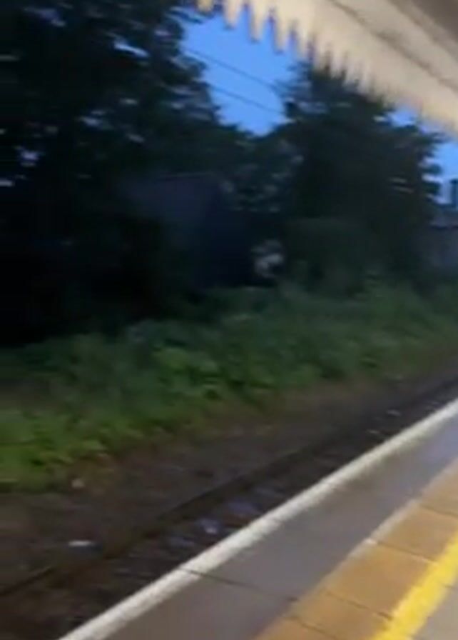 train platform at dusk. The platform is covered by a white awning, and the yellow line marking the edge of the platform is visible. Train tracks run along the side of the platform, with greenery visible beyond the tracks. The sky is a dark blue, and the scene is illuminated by overhead lights. A person's back is visible in the foreground.