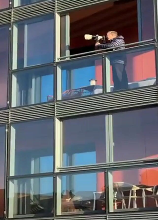 A person is standing inside an open window of a tall building, taking a photo with a large camera and lens