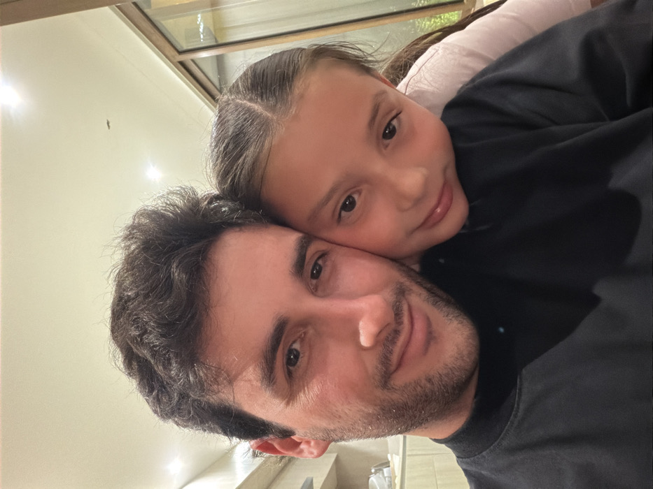 A man with dark curly hair and a beard smiles into the camera. A young girl rests her head on top of his. She also smiles at the camera. The man wears a black shirt. The girl appears to be wearing a white shirt and black sweater. The picture appears to be taken indoors with light-colored walls. There are multiple overhead lights.
