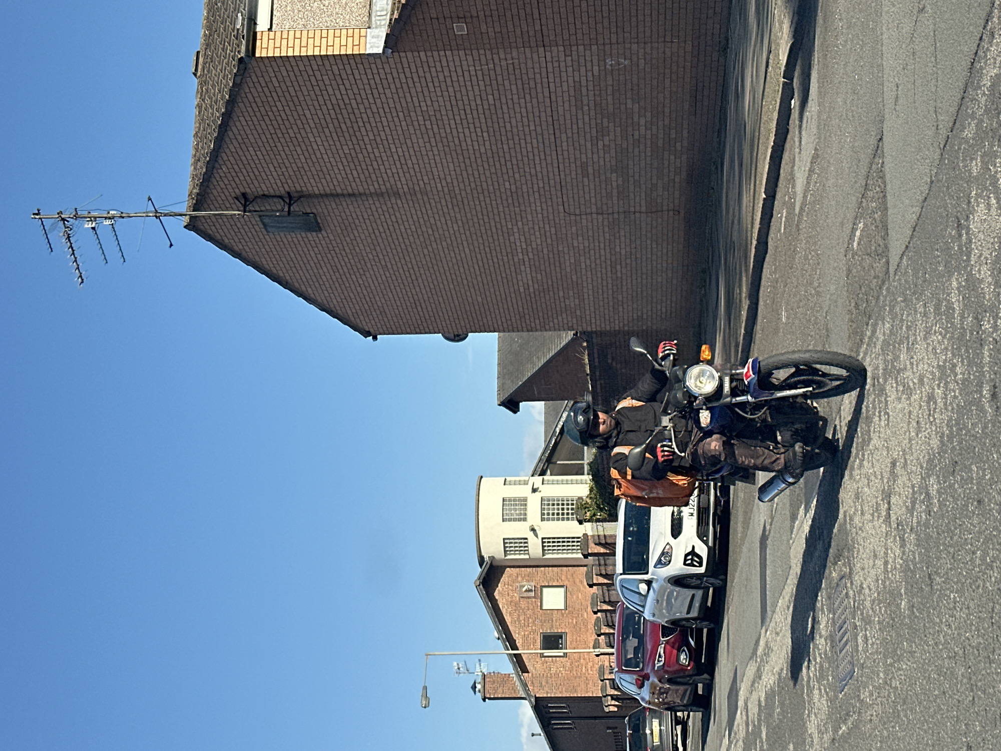 A man wearing a helmet, dark jacket, and dark trousers sits on a parked blue Yamaha motorcycle with an orange delivery bag strapped to the back. The motorcycle has a Union Jack sticker near the headlamp. The motorcycle is parked on a grey asphalt road next to a row of parked cars, including red, white, and grey vehicles. A brick building with an aerial on top stands prominently in the background. The sky is clear and blue. The location is likely Liverpool, United Kingdom, evidenced by the license plates of the parked cars.