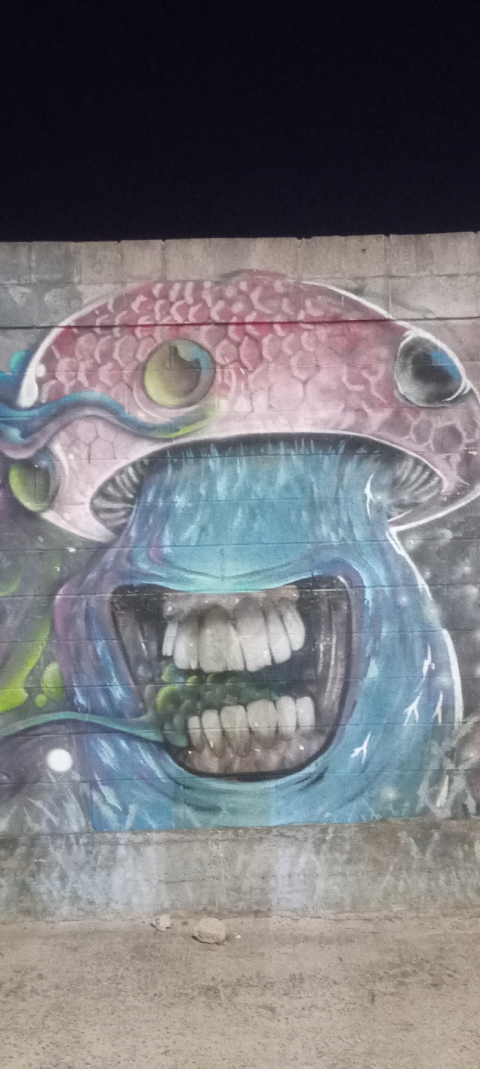 A colorful graffiti mural on a brick wall depicts a grotesque, smiling mushroom monster