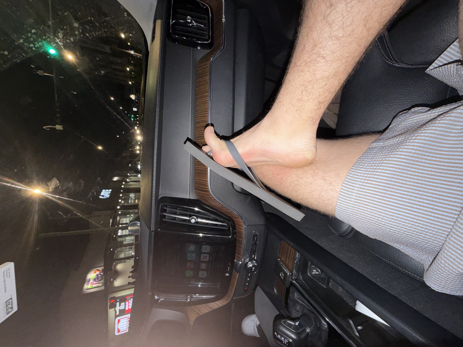 The image depicts the interior of a vehicle at night, looking out through the front windshield onto a commercial street in Gainesville, Florida, United States. Inside the vehicle, a person's bare lower right leg and foot are positioned on the passenger-side dashboard. The leg is hairy, and the foot is partially adorned with a gray flip-flop or sandal, with one strap between the toes and another strap angled across the foot. The person is wearing light-colored, vertically striped shorts. The vehicle's interior features a dark dashboard with a wood-grain trim inlay, a central infotainment screen with visible icons, and a gear selector on the center console. Outside the vehicle, a street is illuminated by various light sources. Across the street, a building displays a prominent, lit sign reading "GATE." Adjacent to it, a partially visible sign indicates "REGULAR" alongside a red gasoline pump icon, suggesting a gas station. Multiple streetlights cast light, and a green traffic signal is visible on the right side of the frame. Distant vehicle headlights are observable. The sky is dark, consistent with nighttime conditions. Specks or residue are present on the exterior of the windshield.