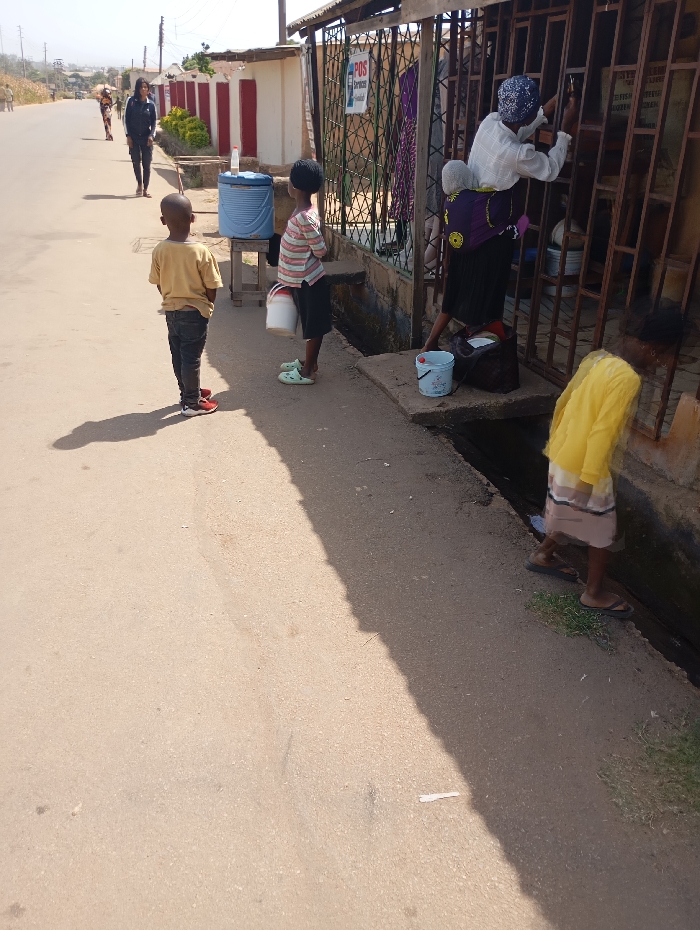 This image depicts a daytime street scene in Barakin Lerawi, Nigeria. The foreground shows a paved road surface with a long shadow cast from right to left. On the right, adjacent to the road, is an open drainage ditch, separating the road from a commercial building. On the paved road, a young boy in a yellow t-shirt, dark jeans, and red and white sneakers stands with his back to the viewer, facing towards the right side of the frame. Further down the road, in the mid-ground, two individuals are visible walking away from the camera. One is an adult female in dark clothing; the other is a more distant figure. On the unpaved shoulder next to the ditch, to the right of the first boy, stands a child in a horizontal striped shirt, dark shorts, and light green sandals, holding a white plastic bucket by its handle. Directly behind this child is a blue plastic water dispenser resting on a small wooden stand. A white bottle, possibly hand sanitizer, is on top of the dispenser. A sign with "POS Services Available" is partially visible on the building behind this setup. Further to the right, an adult female with a blue patterned headwrap, a white long-sleeved shirt, and a dark skirt is leaning forward, reaching up with both hands to grasp or manipulate a section of a dark metal security grate that covers a doorway or window of the building. A baby is strapped to her back in a purple fabric carrier. A light blue plastic bucket and a dark bag are on the ground near her feet, positioned over the drainage ditch. Partially visible to the right of the adult female, another child in a yellow top and a light-colored striped skirt is bent over, facing towards the building. The background features several buildings with reddish-brown lower sections and white upper walls, along with utility poles and a clear sky. The scene is brightly lit by natural sunlight, indicating clear weather.