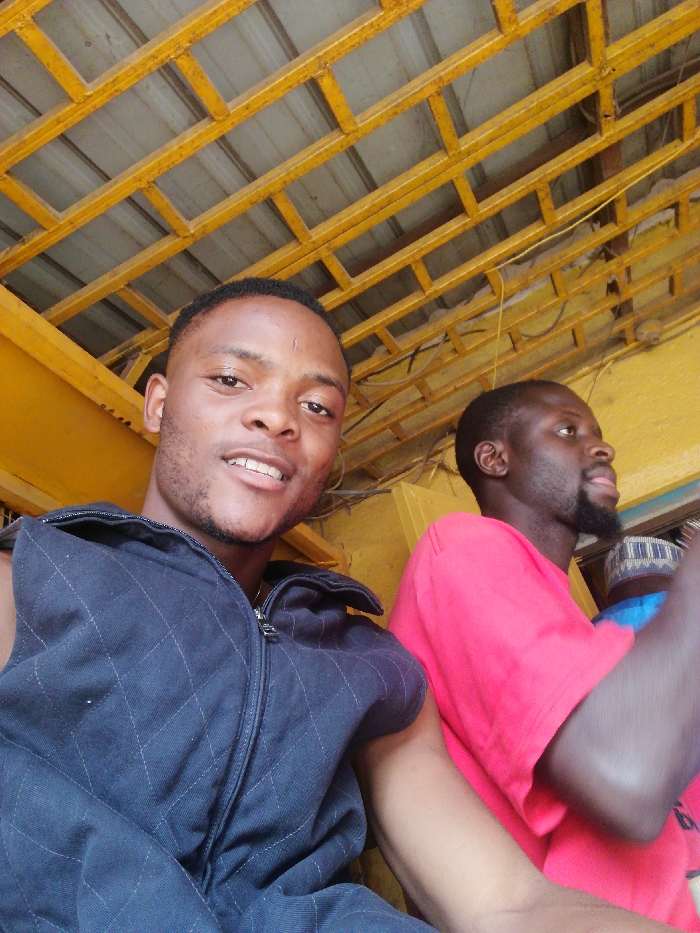 Two dark-skinned men pose for a selfie beneath a yellow-painted ceiling structure. The first man, in the foreground, smiles for the camera. He wears a dark, sleeveless, quilted jacket. Beside him, the second man, in a bright red shirt, glances off to the side with a neutral expression. A patterned white and blue cap peeks into the frame behind the second man. The overall lighting casts shadows.