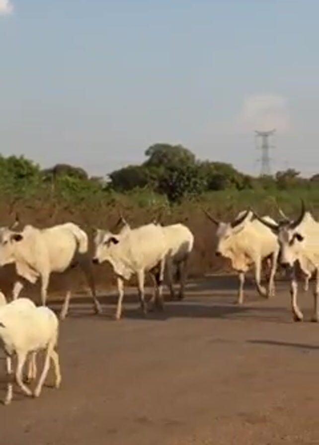 A herd of mainly white cattle with some black patches, accompanied by a group of white sheep and goats, is walking along a dirt road. The cattle have long, curved horns. A person can be seen on the right side of the frame, appearing to herd the animals. The background consists of green foliage and tall electrical towers. The sky is blue with a few clouds.