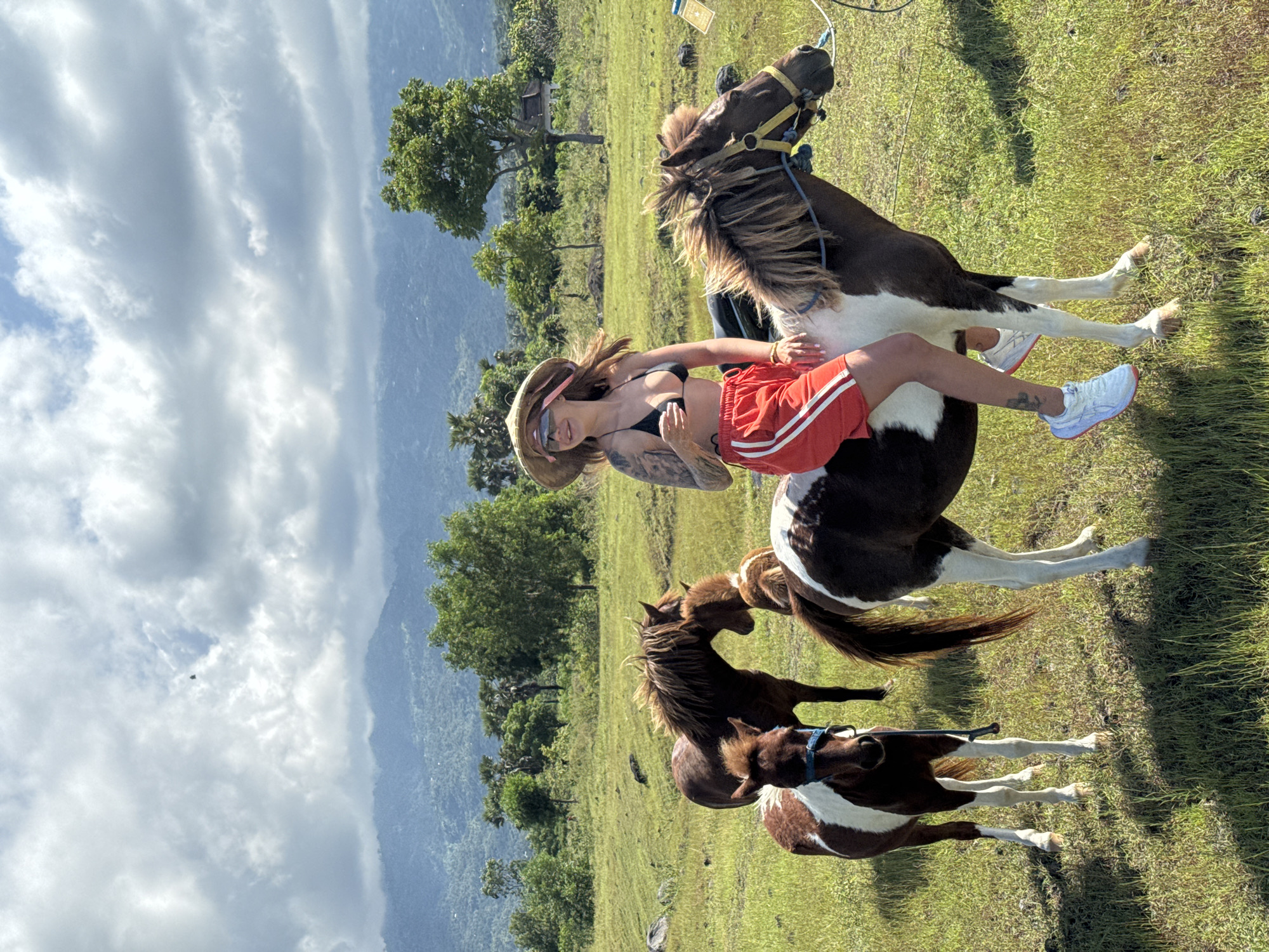 In a verdant field in Tianyar, Indonesia, a fair-skinned woman with tattoos and sunglasses sits astride a brown and white pony. She wears a black top, red shorts with white stripes, a wide-brimmed straw hat, and blue athletic shoes. The pony is equipped with a bridle. Behind them stand two more ponies. A mountain range and partly cloudy sky are visible in the background. The scene is filled with green grass.