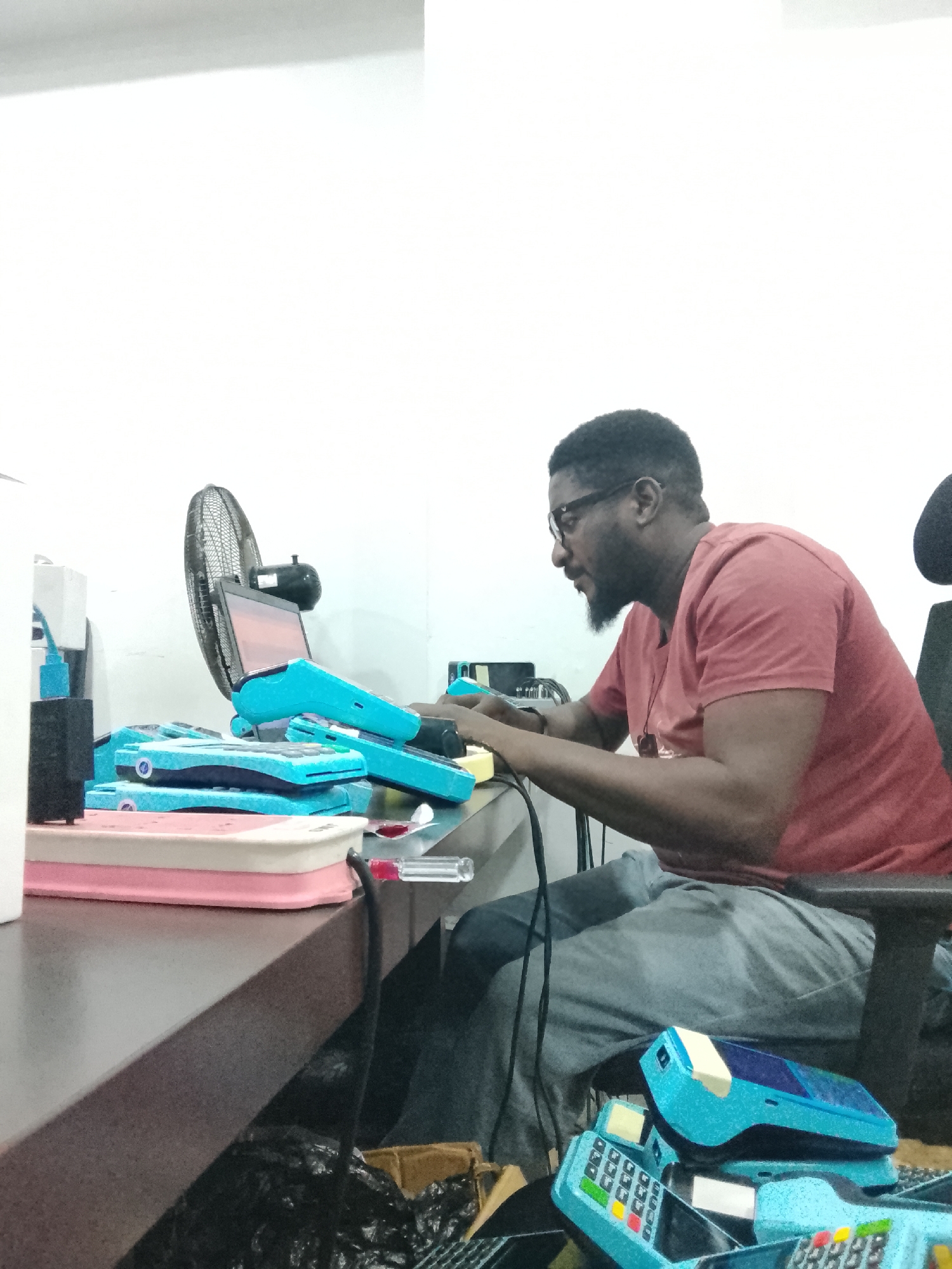 An indoor scene in Jos, Nigeria, depicts a dark-skinned male individual seated at a dark brown desk, facing right in profile. He wears a red short-sleeved t-shirt, grey pants, and glasses, with a beard. His hands are positioned over a silver laptop, whose screen displays a reddish interface. A black oscillating desk fan is situated behind the laptop. Numerous bright turquoise-colored Point-of-Sale (POS) terminals are present: a stack is to the left of the laptop, several are scattered on the desk in front of the man, and a pile rests on the floor or a lower surface to the right of his legs. Each POS terminal features a keypad with numeric and colored buttons. A white power strip with a blue cable is visible on the far left of the desk. A clear-handled screwdriver with a red cap lies on the desk near the man's right hand. The backrest of a black office chair is behind the man. Dark bags or boxes are visible under the desk. The room has plain white walls.