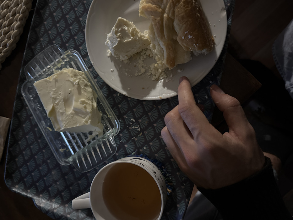 A plate holds bread and a crumbly white cheese, positioned next to a clear dish of butter. A cup of tea sits nearby. A hand with pale skin is near the plate. The scene is set on a tray with a blue and white pattern. There's a glimpse of a woven mat on the left and someone wearing a black sleeve on the right.