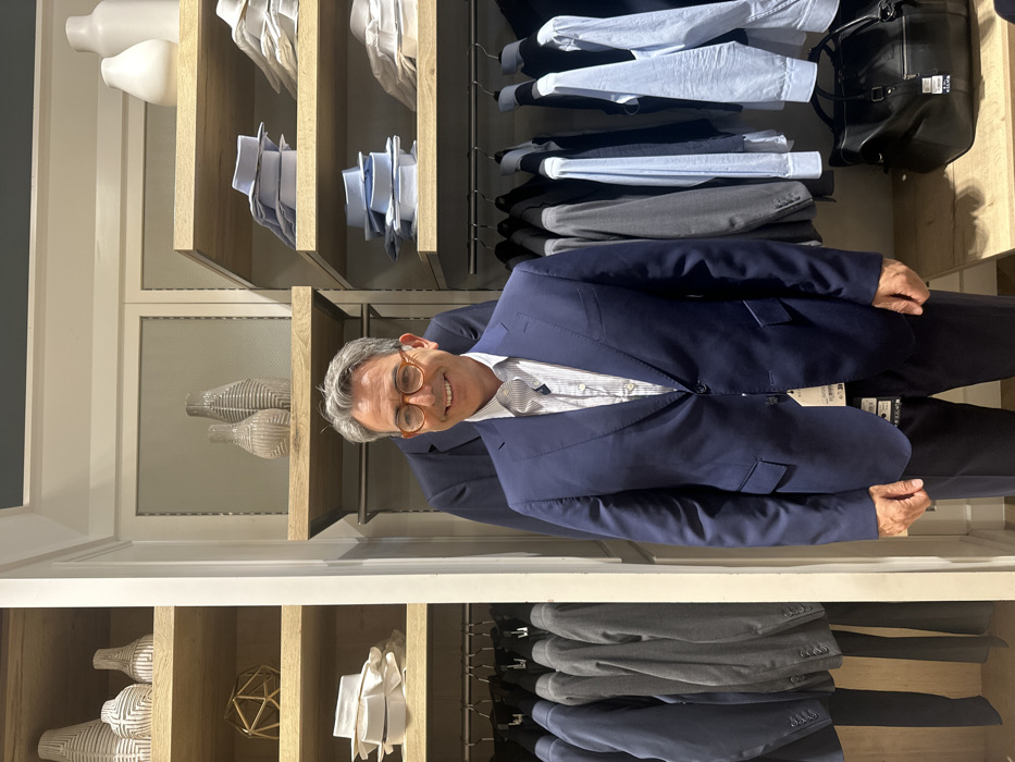 man in a navy blue suit jacket, a white shirt, and dark blue pants standing in a retail store in Serris, France, located at latitude: 48.853, longitude: 2.784. He is smiling and looking at the camera. The man is standing in front of a wall of shelves with various items on display, including decorative vases, stacks of folded shirts, and clothing on hangers. The shelves are made of light wood. The man is standing next to a rack of suits and a black leather duffel bag. The store has white walls and a light wood floor. The man's hands are at his sides. The store is brightly lit. The man is likely a customer in a clothing store.