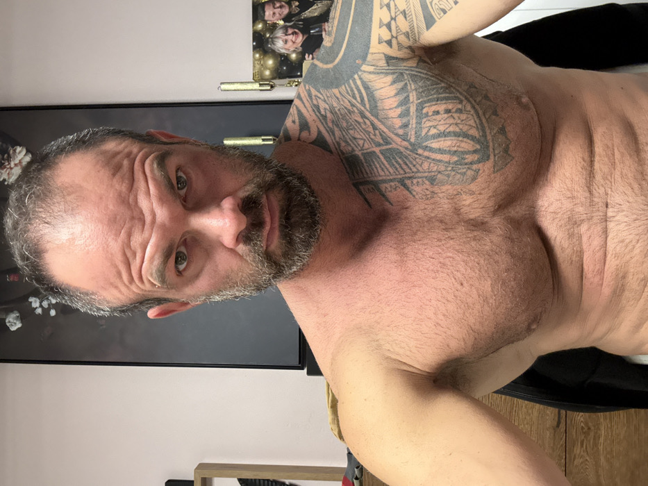 The image displays an adult male from the mid-chest up, located in an indoor setting within Marche-en-Famenne, Belgium. The subject is a muscular Caucasian male with short, receding dark hair and a full beard, directly facing the camera with a serious expression and prominent forehead wrinkles. He is shirtless, revealing body hair on his chest and an extensive dark tribal-style tattoo covering his left shoulder and upper chest. In the background, a light-colored wall is visible, featuring a large, dark-framed artwork with a light design centrally. To the left, a portion of a light wooden shelf unit is present. To the right, decorative golden candle holders are mounted on the wall above a framed photograph depicting two smiling individuals against a black and gold background. The scene is illuminated by interior lighting.