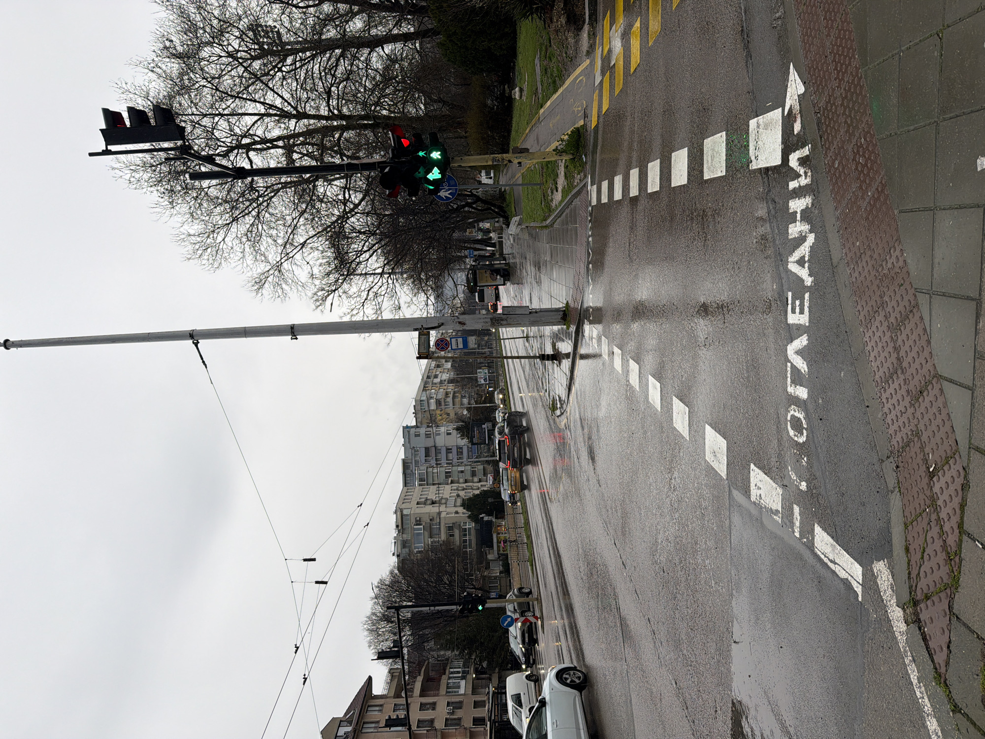 The image depicts a street scene on a wet day in Varna, Bulgaria