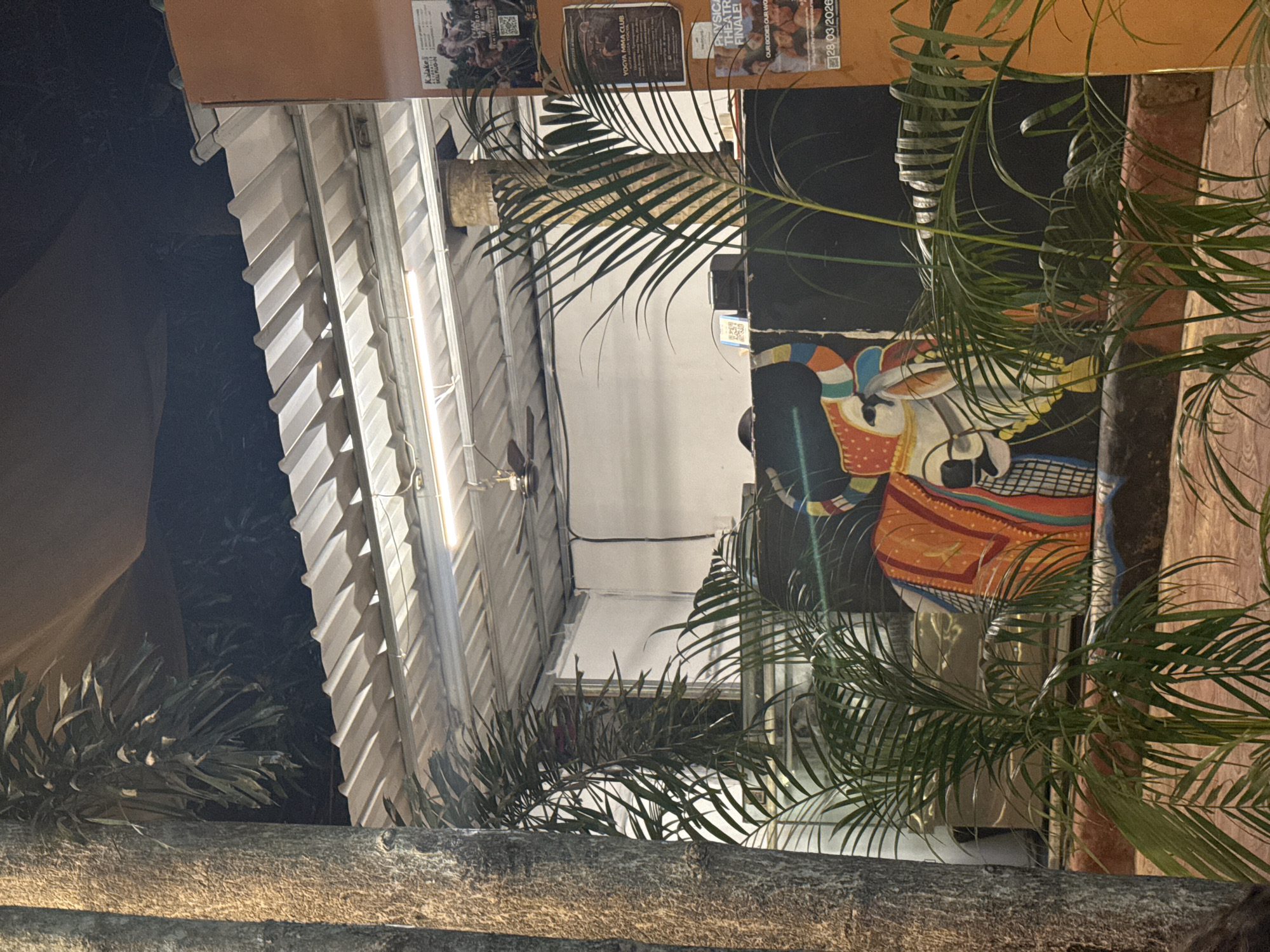 n outdoor scene in Arambol, India. The foreground features a rough-textured, illuminated tree trunk. Above, a building with a corrugated metal roof is partially visible, interspersed with palm fronds. Several posters or advertisements are attached to the building's façade. Further along, a painted mural depicting a stylized animal figure can be seen. The lighting suggests that the photo was taken during evening or nighttime.