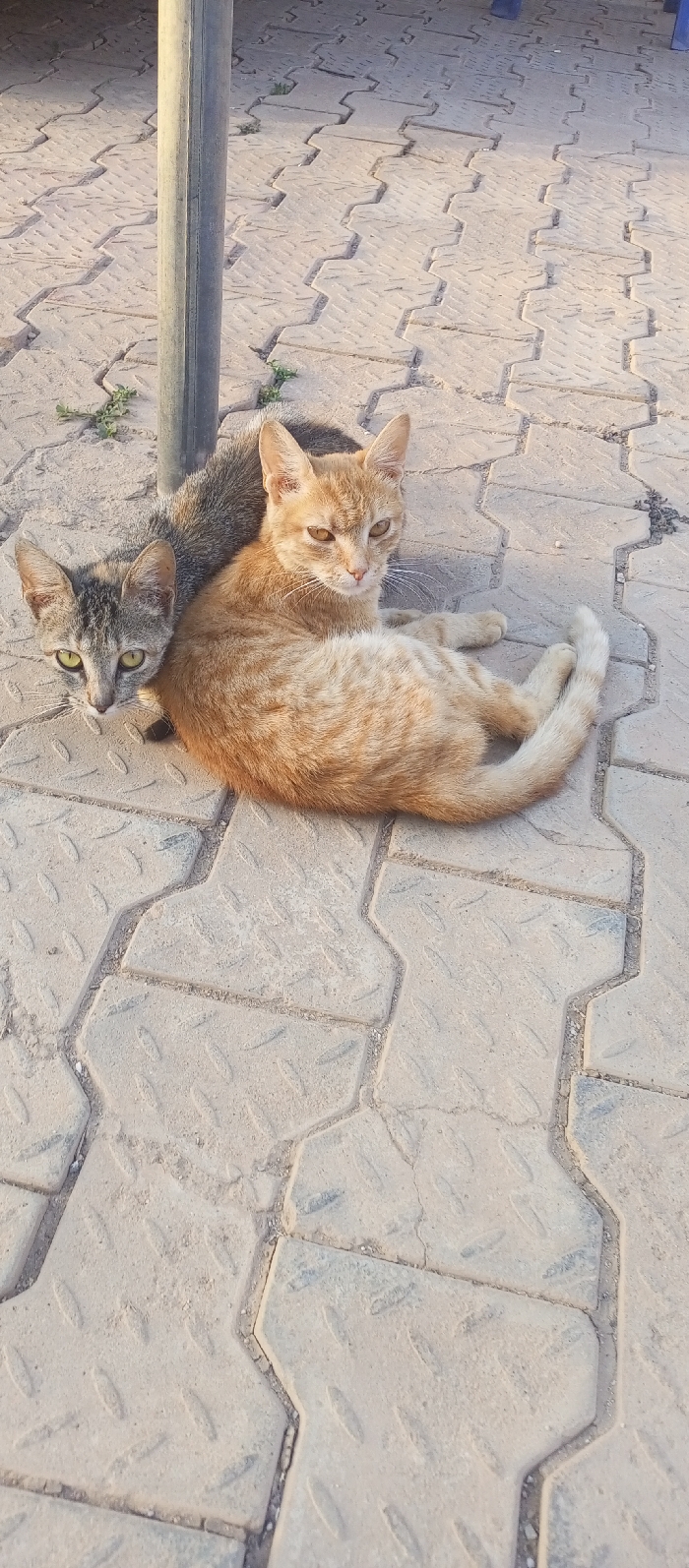 - "Two cats rest on a paved surface beside a gray metal pole" by FM-NFvRh2, licensed under CC BY 4.0