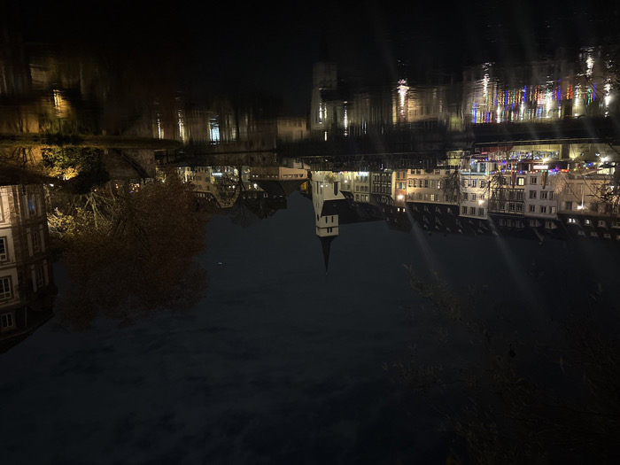An upside-down night scene shows buildings reflected in dark water