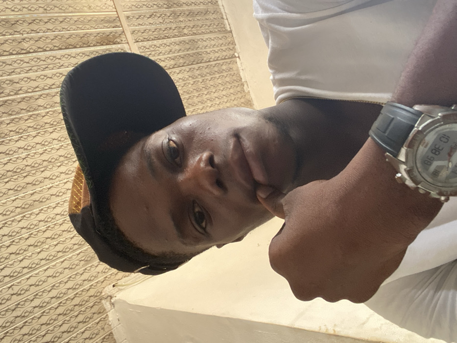 A close-up, low-angle photograph captures a single male individual indoors. The subject has dark skin and is wearing a white short-sleeved t-shirt and a black baseball cap with a patterned, possibly gold and green, brim, worn backward. A thin gold-colored chain is visible around his neck. His left hand is raised, with the index finger touching his lower lip/chin area, while the thumb rests beneath his chin. A silver-toned wristwatch with a dark grey rubber strap is present on his left wrist, displaying a digital reading partially visible as "10 38 98". The background features a light-colored, possibly cream or beige, wall to the left and a patterned ceiling composed of repetitive, interlaced panels, extending across the top and right side of the frame. The subject is looking directly into the camera. The precise location within the city of Igbesa, Nigeria, cannot be determined from the visual evidence presented.