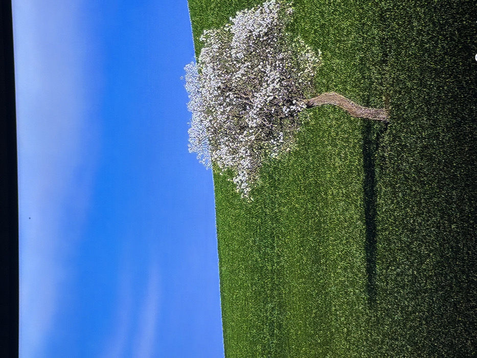 The scene depicts an outdoor landscape in Madzherito, Bulgaria, under a clear blue sky with minimal cloud cover. A large, undulating green hill, covered in short, dense foliage, occupies the lower two-thirds of the image, sloping upward from left to right. Centered in the mid-right portion of the green hill is a single deciduous tree with a visible, curved brown trunk. The tree is in full bloom, densely covered in small white flowers, suggesting it is a fruit or ornamental tree during springtime. An elongated, dark shadow cast by the tree extends horizontally across the green grass towards the left. The lighting indicates a light source positioned to the right and slightly behind the tree. No individuals or man-made structures are visible. The image appears to be a photograph of a screen displaying this landscape, indicated by a dark border at the top and a small dark speck in the upper left sky region.