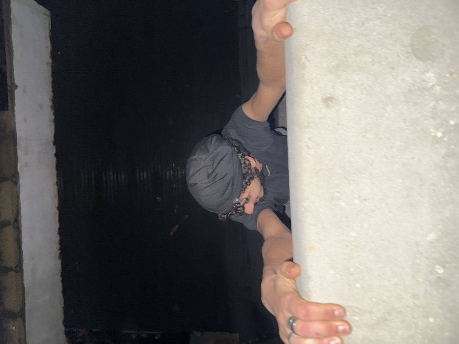 A person clings to a concrete structure, illuminated by harsh light