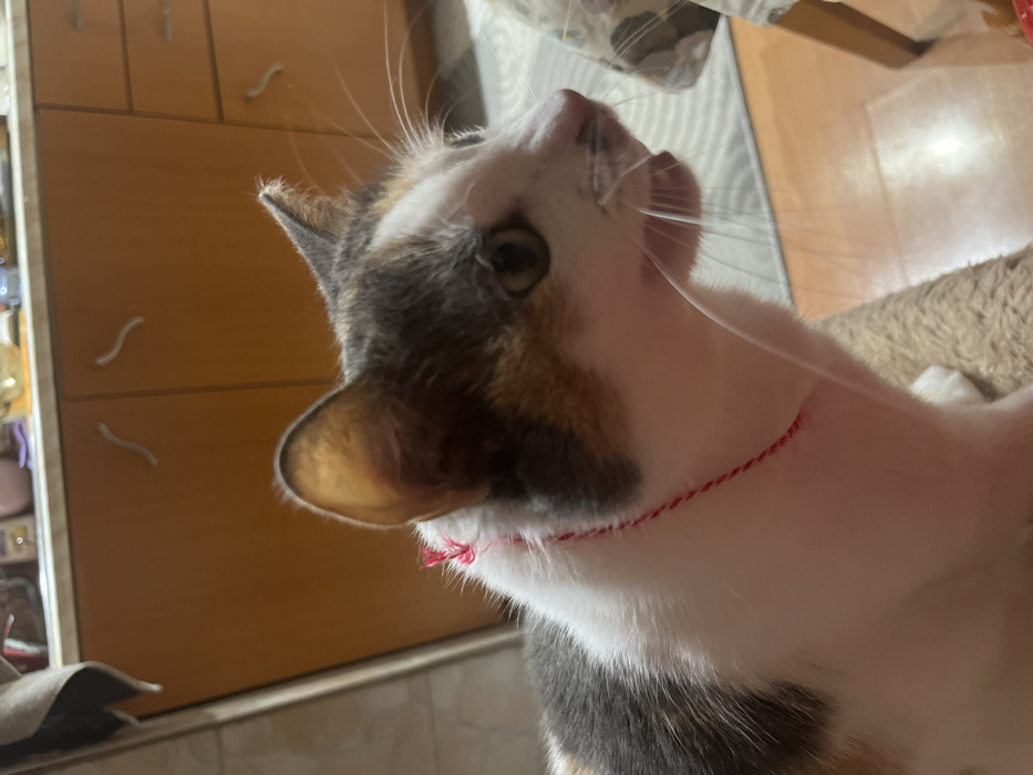 This image depicts an indoor domestic scene within what appears to be a kitchen or dining area, consistent with a residence in Sofia, Bulgaria. The central subject is a calico cat, distinguished by its white, grey, and orange-brown fur patches, captured in profile and facing towards the right side of the frame. A thin, braided red and white string, resembling a martenitsa, is tied around its neck, serving as a collar. The cat's mouth is slightly open, revealing a portion of its gums and teeth, while its visible eye is directed forward. In the immediate background, light brown wooden kitchen cabinets with two distinct white, curved handles are visible. Above these cabinets, a countertop displays several indistinct household items and a grey textile object. The surface directly beneath the cat is a textured, light brown material, consistent with a rug or a pet bed. To the far right, a section of a chair with patterned upholstery and a wooden leg is partially discernible. The floor in the lower right is light-colored, suggesting tile or wood. The scene is illuminated by interior artificial lighting. No human individuals are present in the frame.