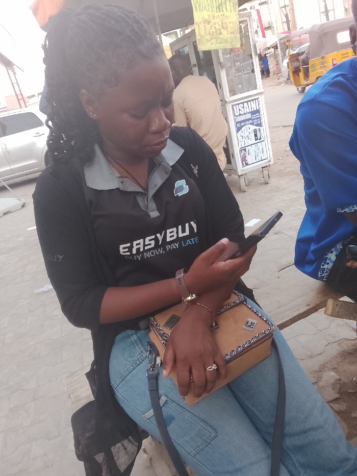 A woman with braided hair sits outdoors, holding a smartphone. She wears a black shirt with "EASYBUY" printed on it and light blue jeans. A tan-colored purse rests on her lap. In the background, there's a parked silver car and a three-wheeled yellow vehicle. Also visible are a man in a tan shirt standing near a glass display case with "USAINI" on it, and another person wearing a blue shirt.