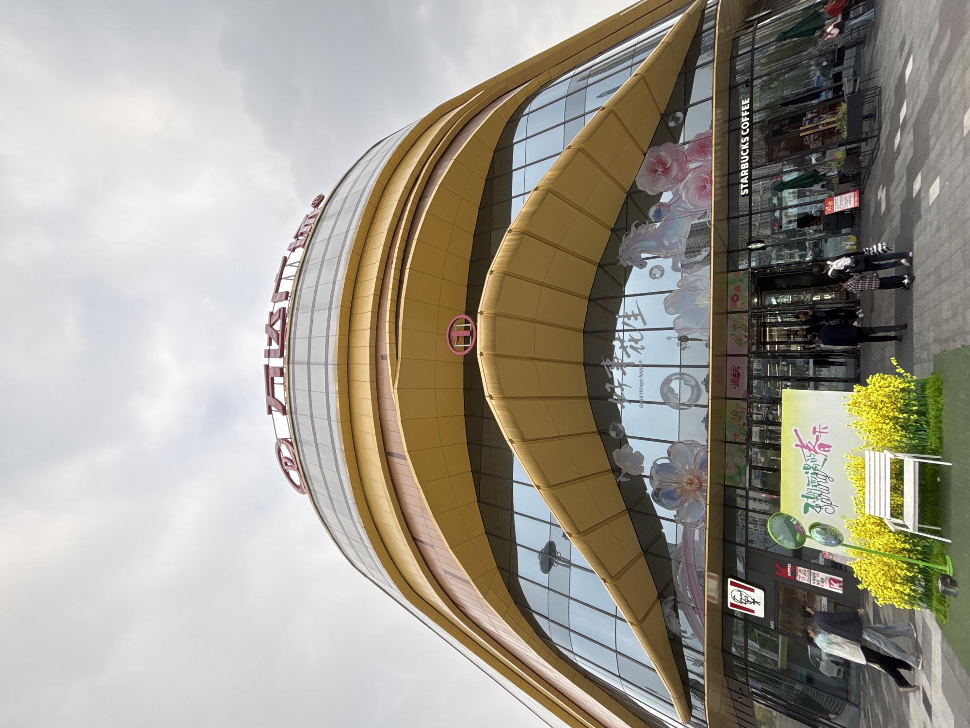 This image depicts the exterior of a multi-story commercial building identified as Wanda Plaza (万达广场) in Jiangjin, China. The building features a distinctive curvilinear design with stacked, wave-like architectural elements clad in gold/yellow panels and extensive reflective glass. A large red sign displaying "万达广场" is positioned at the top. The ground floor hosts storefronts for KFC and Starbucks Coffee, with their respective logos visible. The large glass windows above the ground floor display decorative decals of pink and white flowers and a white horse, alongside Chinese characters that include "好事花生" ("Good things happen"). In the foreground, a paved pedestrian area features a decorative display. This includes a large planter filled with bright yellow artificial flowers, a white park bench, and two slender green poles topped with circular reflective elements. A prominent white rectangular sign with Chinese text "潮潮的春天" and "Spring" in English is also part of this display. Approximately 10-15 individuals are visible on the ground level. Two individuals are walking left past the KFC entrance. Near the Starbucks entrance, an adult and a child, potentially on a scooter, are walking towards the building. Other individuals are seen entering or exiting the building, or seated at outdoor tables near Starbucks. The sky is overcast with light grey clouds.