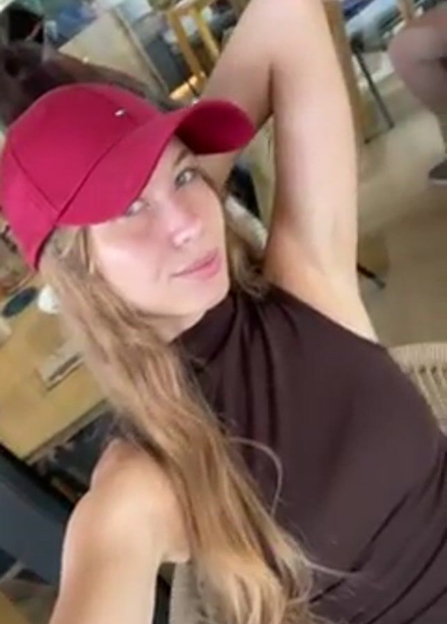 A woman is sitting in a wicker chair in an indoor space with a table, smiling and looking at the camera. She has blue eyes, light brown hair, and fair skin. She wears a dark brown turtleneck top and a red baseball cap. She waves at the camera. Through a glass wall, there's a partial view of other people at tables, one wooden and one wicker, suggesting a restaurant or cafe setting. The lighting is bright and natural. The camera gets very close to her face while she smiles.