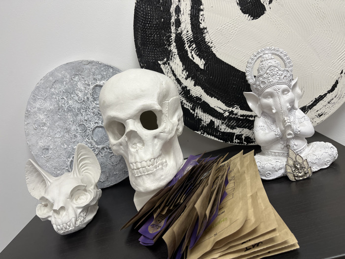 In the city of Ovoshchnoy, Russia, an indoor scene depicts a collection of decorative objects arranged on a black, smooth surface, likely a shelf or table. The background is a plain white wall. No people are present. From left to right, the primary objects include a white, detailed replica of a bat-like skull with prominent ears and fangs. To its right stands a larger, white, anatomically detailed replica of a human skull, hollow eye sockets visible. Behind these two skull replicas, a circular grey textured artwork, suggestive of the moon's surface, is partially visible. Further to the right, a white figurine of the Hindu deity Ganesha is seated in a meditative posture, hands pressed together, positioned in front of a larger circular artwork featuring a black, textured, swirled pattern on a white background. A silver lotus-shaped pendant with a small Ganesha figure rests near the base of the white Ganesha idol. In the foreground, fanned out on the black surface, is a stack of multiple brown paper envelopes or small bags, each containing or revealing purple-colored material or packaging.