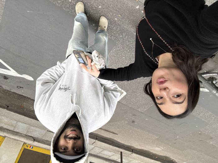 Two individuals are captured in a selfie on a city street in Paris, France