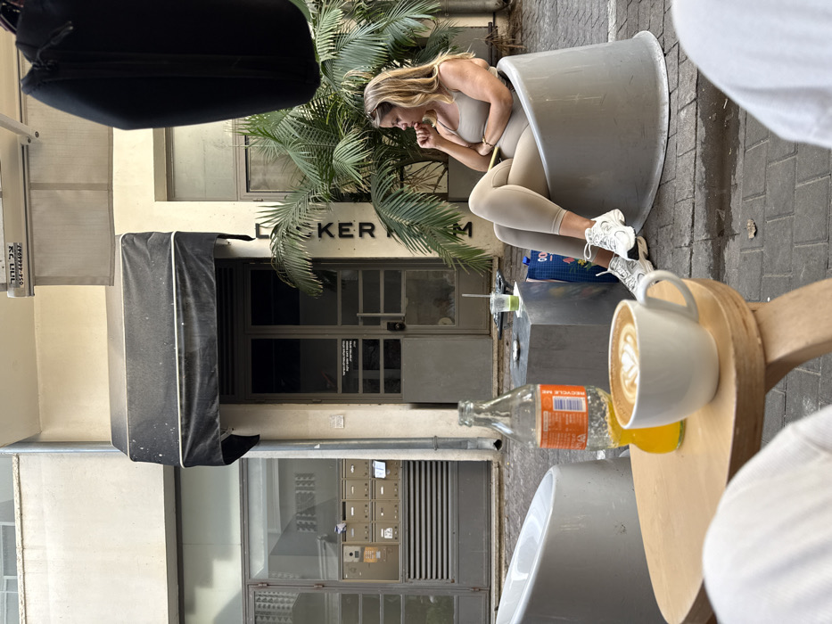 An outdoor cafe setting is depicted on a paved street in Tel Aviv, Israel. Background signage includes "צל ההר 054-4444947" on an awning and partially visible vertical lettering "KERAM" on a building façade. In the midground, a woman with blonde hair, dressed in a light tan tank top and matching leggings, sits in a gray, bucket-style chair. Her left hand is raised to her mouth, and she wears white sneakers with black accents. Adjacent to her, a square, gray table holds a clear plastic cup containing a green beverage with a straw. A blue shopping bag with a white graphic rests against the table's base. In the foreground, from the perspective of a seated individual (indicated by visible white-clad knees), a round wooden table displays a white ceramic coffee cup with latte art and a clear glass bottle with an orange label containing an orange liquid. The background features two light-colored urban buildings: the left structure has a large glass-paneled entry revealing multiple horizontal mailboxes and a slatted metal gate; the right structure features a dark fabric awning above a set of dark-framed double doors, partially obscured by a large palm tree. The ground consists of irregular stone block paving.