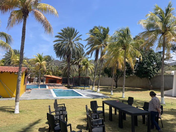 The image displays an outdoor recreational property located in the city of San Juan Bautista, Venezuela, under a clear blue sky. The foreground features a manicured green lawn containing several black plastic chairs and a long, black plastic table. A single female individual, observed from behind, stands on the lawn near the right side of the black table, wearing a light-colored patterned short-sleeved top and dark trousers. In the midground, a grey paved area separates the lawn from two rectangular swimming pools filled with blue water. To the left of the pools stands a yellow building with an orange tiled roof. Further back and to the right of the pools, an orange structure with an open front and a dark roof is visible. A trampoline with a black mat and safety netting is positioned behind this orange structure. Numerous palm trees, some with white-painted lower trunks, and other green deciduous trees are scattered throughout the property. A concrete wall forms the right boundary of the property, partially revealing a white building beyond. The background consists of dense green vegetation and distant mountains beneath the clear sky.