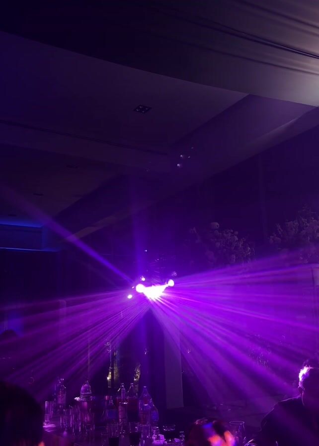The scene appears to be in a dimly lit room, likely a reception hall or event space. A bright purple light fixture emits beams across the room. In the foreground, there's a bar area with various bottles and glasses visible. Two people are partially visible in the frame, one on the left and one on the right. The ceiling is dark and features some architectural elements, and some floral decor is visible in the background.