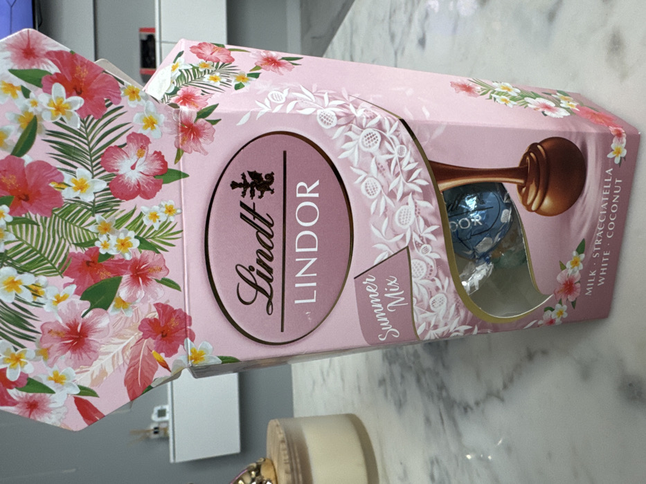 A pink Lindt LINDOR "Summer Mix" chocolate box is positioned upright on a polished grey and white marble-patterned surface