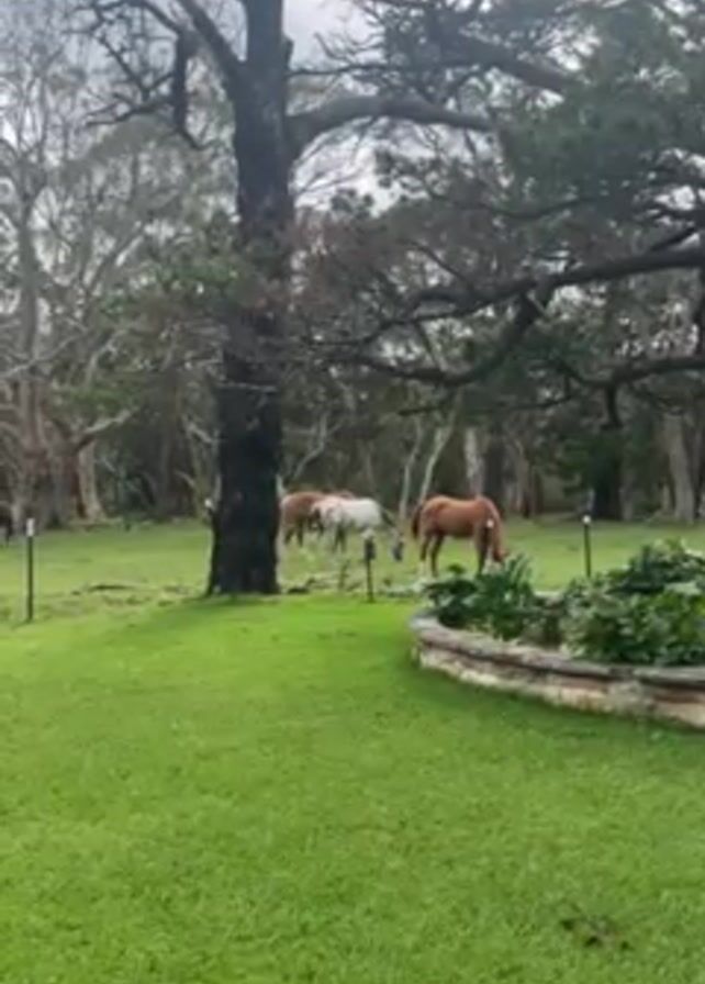 grassy yard under a cloudy sky, bordered by trees in the background. In the distance, there are three horses grazing near the trees, one brown, one white, and one with brown and white markings. In the foreground, a small stone planter is visible along the right side of the screen. A large, bare tree stands near the left side of the screen.