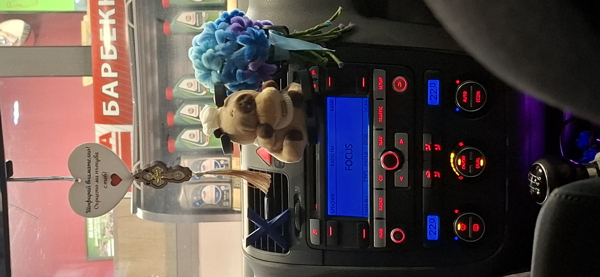 dashboard of a car, possibly a Volkswagen, with a blue and purple flower decoration and a plush toy attached to the air vent. The car radio is on, tuned to "FOCUS." A hanging heart-shaped ornament with Bulgarian text and a cross are also visible, likely a good luck charm for the driver. The climate control panel is lit up, with settings for temperature (22.0), and other functions. A gear stick is seen on the right. Through the windshield, a store window with the word "БАРБЕКЮ" (Barbecue in Bulgarian) is visible, suggesting the location is likely Botevgrad, Bulgaria. The reflections show containers that may be oil or coolant. The interior of the car is partially visible, including the driver's seat.