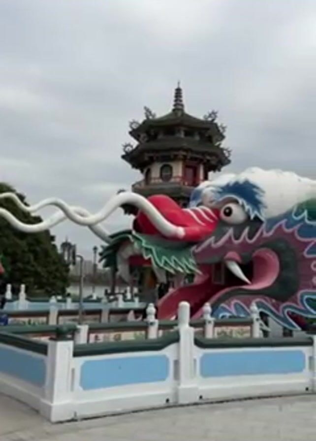 large, colorful dragon statue in front of a traditional Chinese pagoda