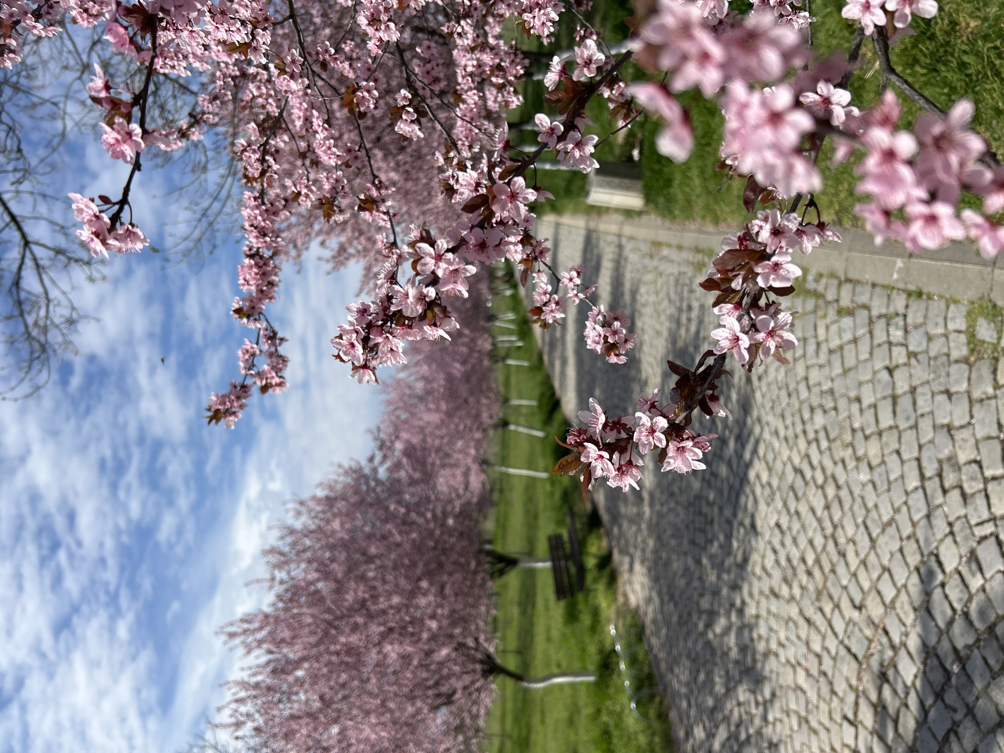 pathway in a park in Plovdiv, Bulgaria, lined with blooming trees with pink flowers. The path is paved with grey cobblestones. There are benches along the pathway. The sky is blue with white clouds. The image is taken from a low angle with a focus on the pink blossoms of the trees overhead.