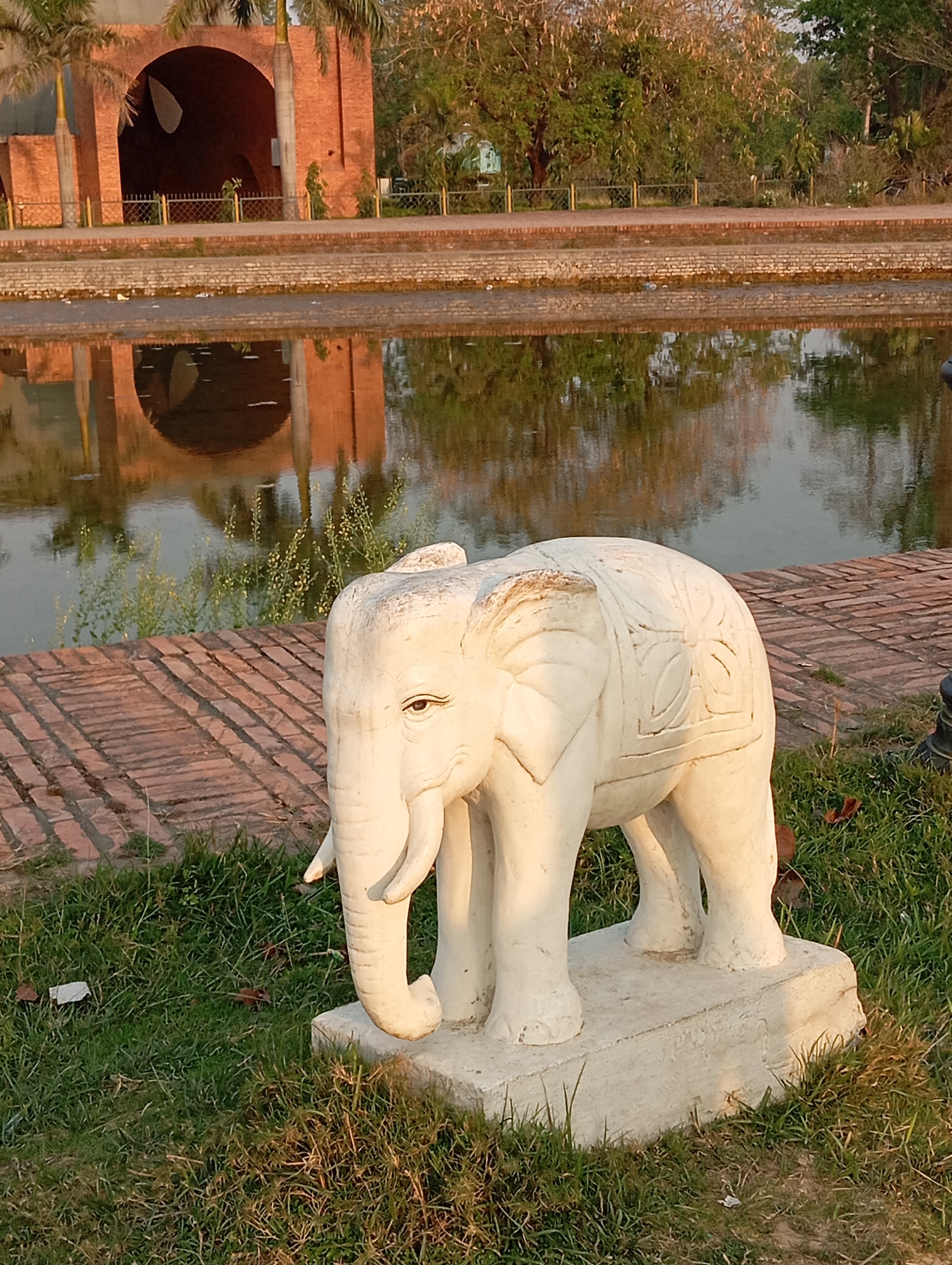 An outdoor scene is depicted at Ghantaghar Park, Birgunj, Parsa District, Nepal, illuminated by low, warm sunlight, suggesting early morning or late afternoon. A white, weathered concrete elephant statue, positioned on a rectangular base, occupies the foreground, oriented left. The statue exhibits carved eye details, short tusks, and an ornate, saddle-like pattern sculpted onto its back. It rests on a section of green grass containing minor debris. Immediately behind, a reddish-brown brick pathway parallels a still body of water, consistent with a pond or canal. A low brick retaining wall delineates the water's edge, with sparse green vegetation present. The water's surface reflects background trees and structures. In the background, beyond the water, a prominent red brick structure is visible, featuring a large, dark arched opening. A tall palm tree stands to the structure's left. Dense green trees line the distant background to the right of the structure, partially screened by a light-colored metal fence along the far bank. No human figures are present.
